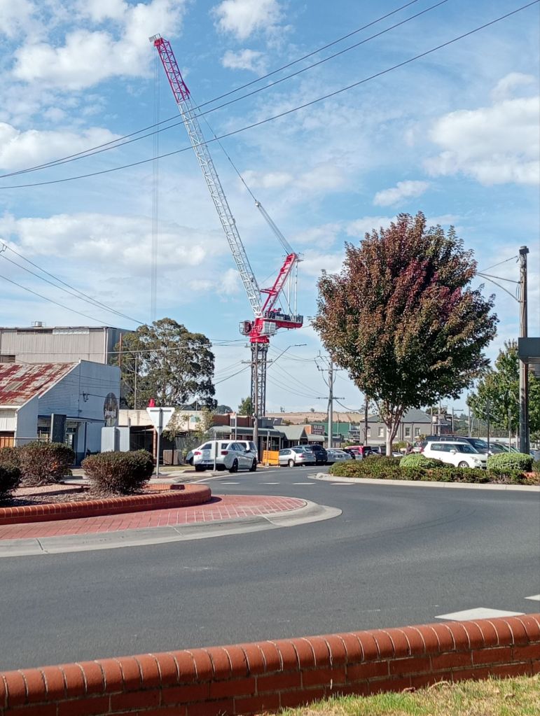 Heading for the centre of Warragul, now features a tall centre poll crane rising above the town centre. While it hasn’t been unusual to see truck mounted cranes at work in the town centre involved in building or tower construction, I think this crane, which is normally seen in the city, is for the first time to be seen in Warragul