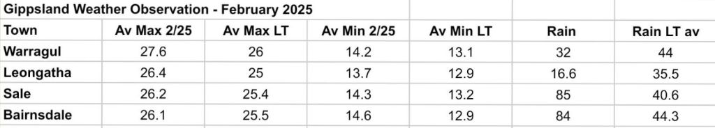 Warragul was the warmest town in Gippsland in February averaging a maximum of 27.6 degrees, approx one degree more than other Gippsland towns.