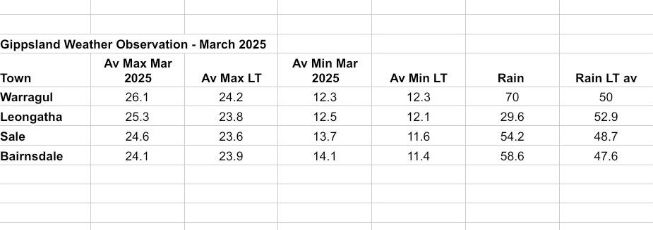 Most areas of Gippsland experienced above 50 millimeters of rainfall for March over two events in the middle of the month. Leongatha for the same events recorded a total just short of 30 millimeters. Overall, March rainfall in Gippsland was below average except for Bairnsdale.